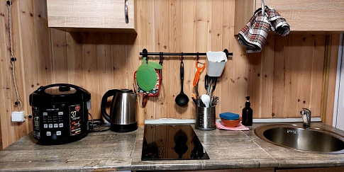 1 этаж - прихожая, кухня (индукционная плита, холодильник, посудомоечная машина, микроволновая печь, чайник, кофемашина, посуда на 8 персон), гостиная (стол, телевизор), двуспальный диван, санузел с душем и стиральной машиной, сауна.