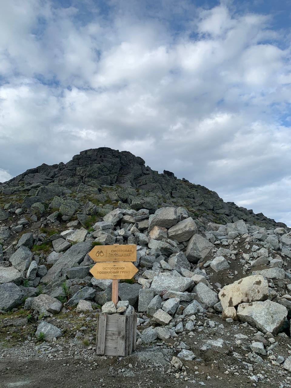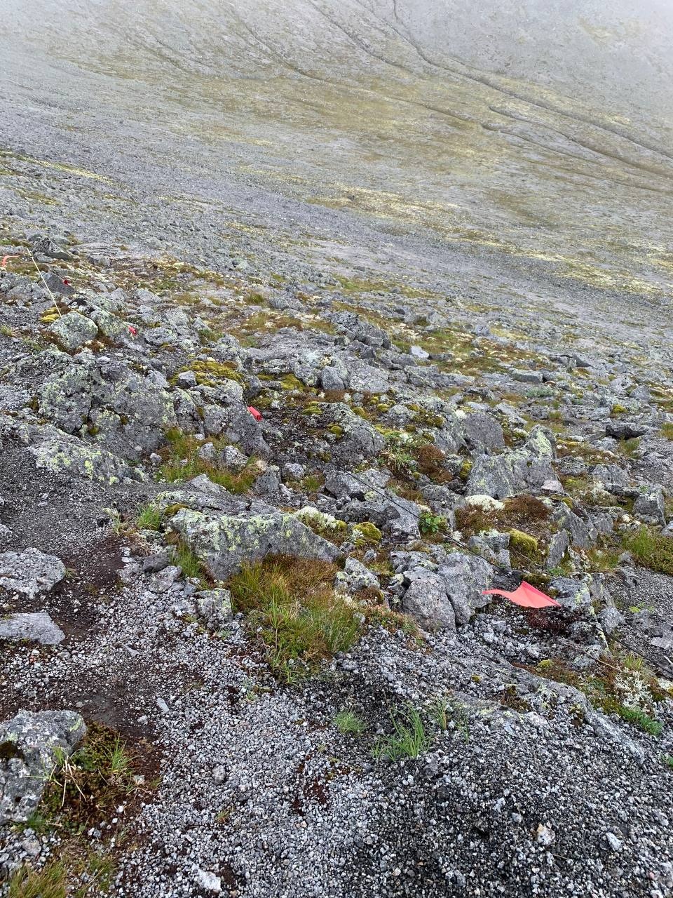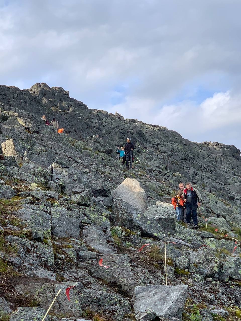 Далее, после прохода старого желтого автомобиля, начинается более сложная тропа по каменному холму. Справа пологий обрыв ограничен флажками. Тропа действительно интересная, в меру сложная. Ее одобрил наш профессиональный альпинист.