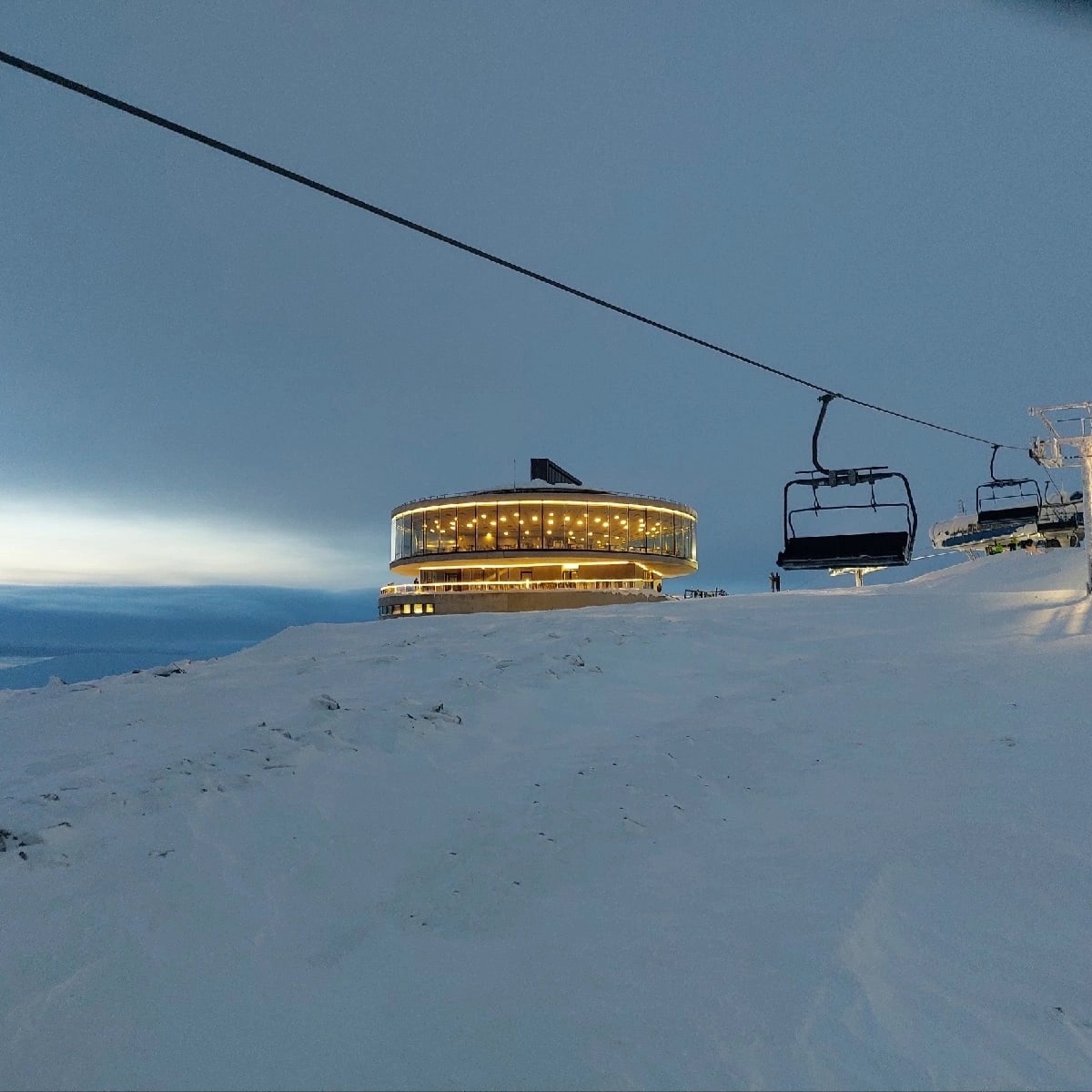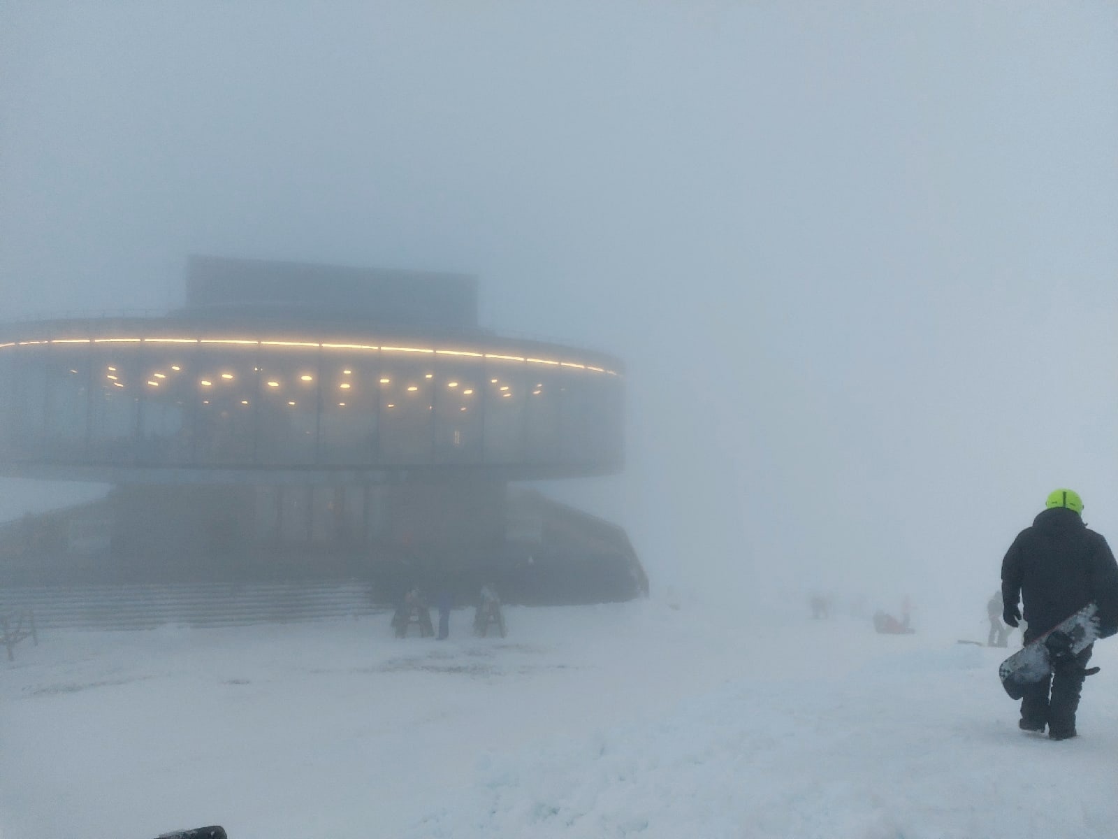 Поднимаясь на вершину горы на Бигвуде, видишь вдруг летающую тарелку. «А, показалось» думаешь, а нет..Вот она, стоит, светится, в зимнем тумане и не разглядеть нормально